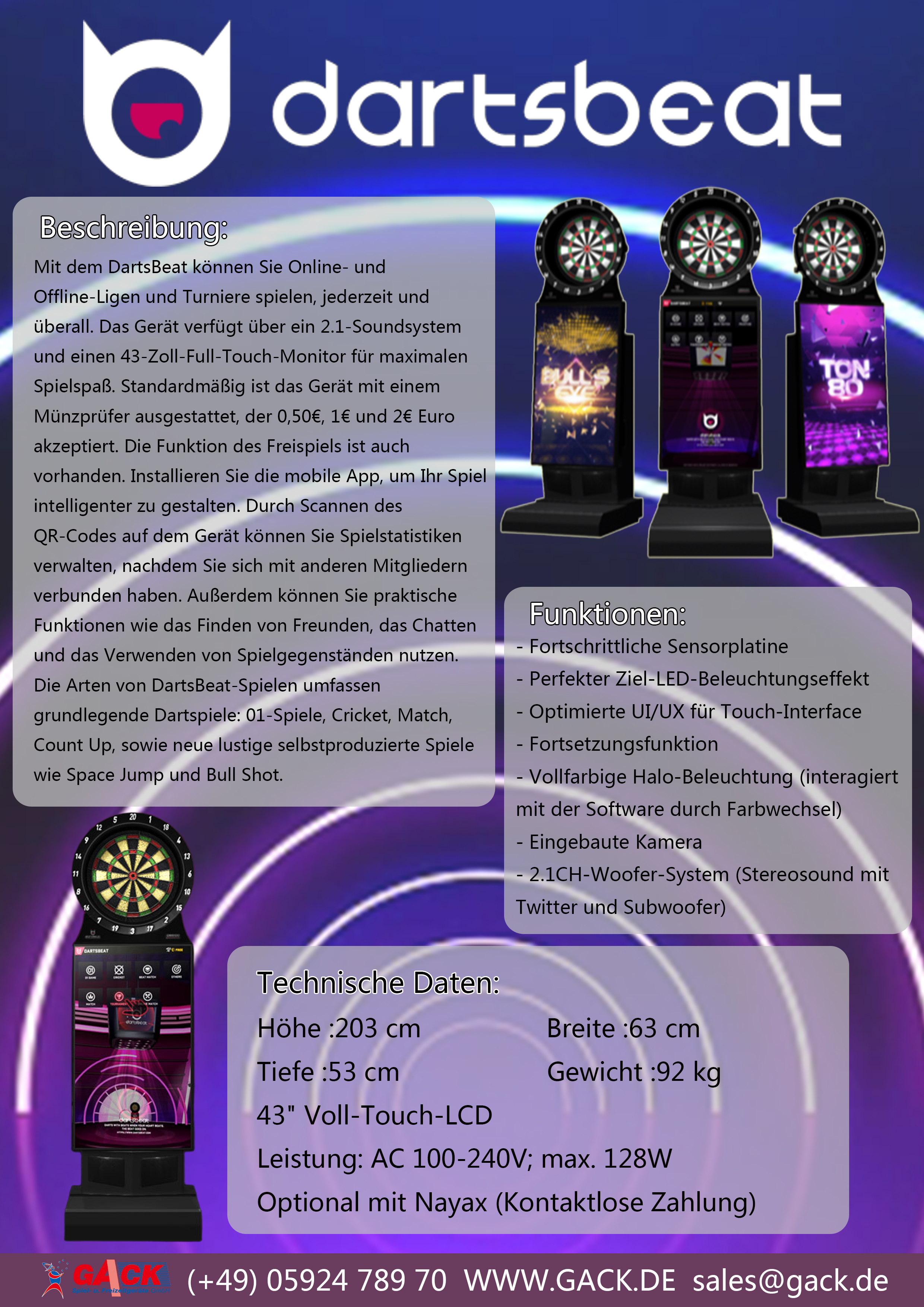 Mit dem DartsBeat können Sie Online- und Offline-Ligen und Turniere spielen, jederzeit und überall. Das Gerät verfügt über ein 2.1-Soundsystem und einen 43-Zoll-Full-Touch-Monitor für maximalen Spielspaß. Standardmäßig ist das Gerät mit einem Münzprüfer ausgestattet, der 0,50€, 1€ und 2€ Euro akzeptiert. Die Funktion des Freispiels ist auch vorhanden. Installieren Sie die mobile App, um Ihr Spiel intelligenter zu gestalten. Durch Scannen des QR-Codes auf dem Gerät können Sie Spielstatistiken verwalten, nachdem Sie sich mit anderen Mitgliedern verbunden haben. Außerdem können Sie praktische Funktionen wie das Finden von Freunden, das Chatten und das Verwenden von Spielgegenständen nutzen.