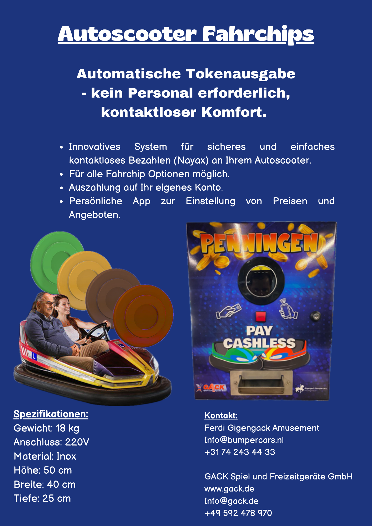- Innovatives System für sichere und einfache kontaktlose Zahlungen (Nayax) auf Ihrem Autoscooter.